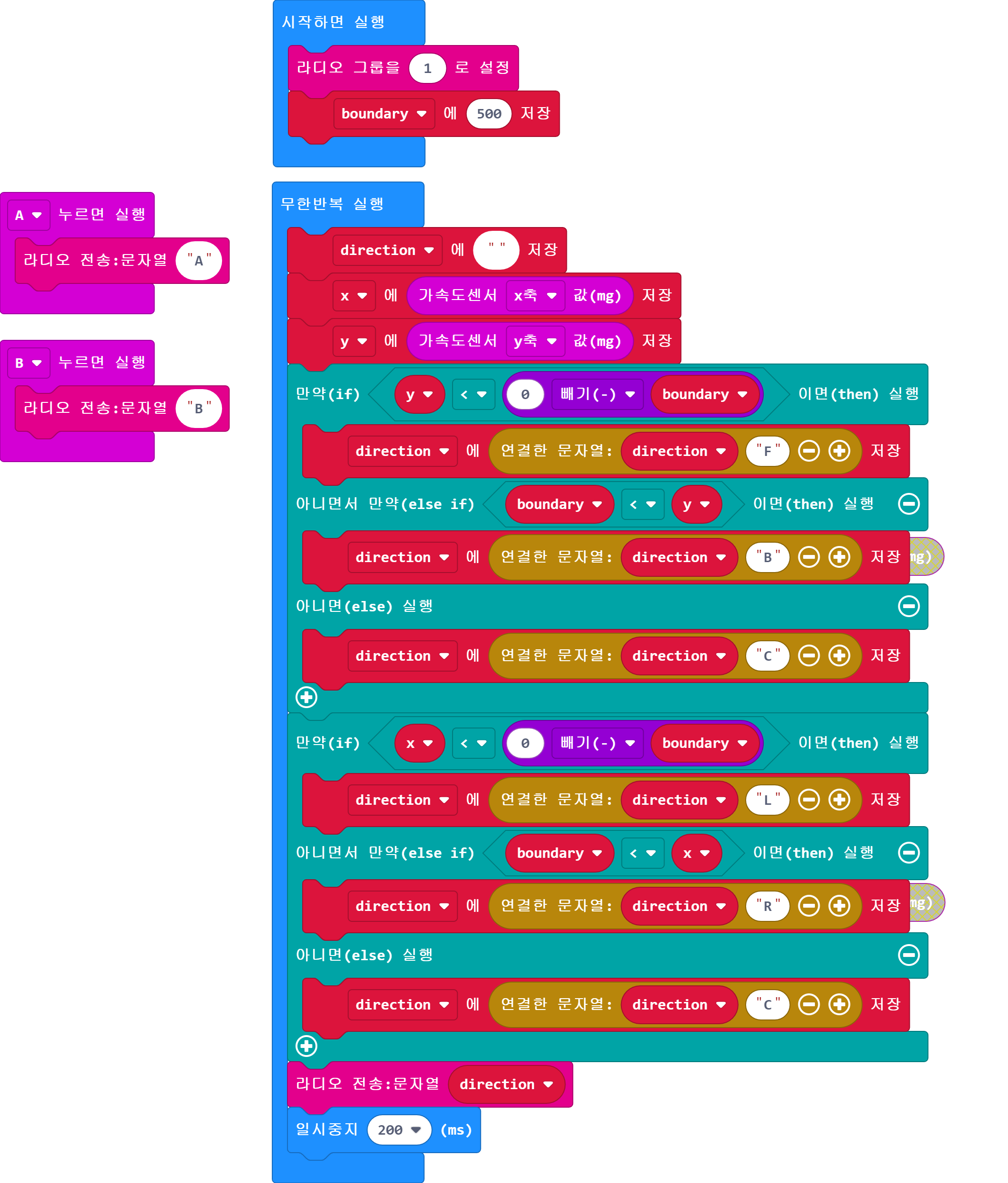 자유 미션에는 변수를 많이 사용했다. 그리고 반응(이벤트) 방식 블록코딩을 적극적으로 사용했다(원래 반응 방식이지만). [라디오 수신하면 실행], [무한반복 실행] X 2 블록에서 정해지지 않은 순서대로 실행 된다. 이 부분을 신경써주지 않으면 의도한 대로 프로그램이 동작되지 않는다. 이 부분을 유심히 본다면 어렵지 않게 블록 코드를 이해할 수 있다.
